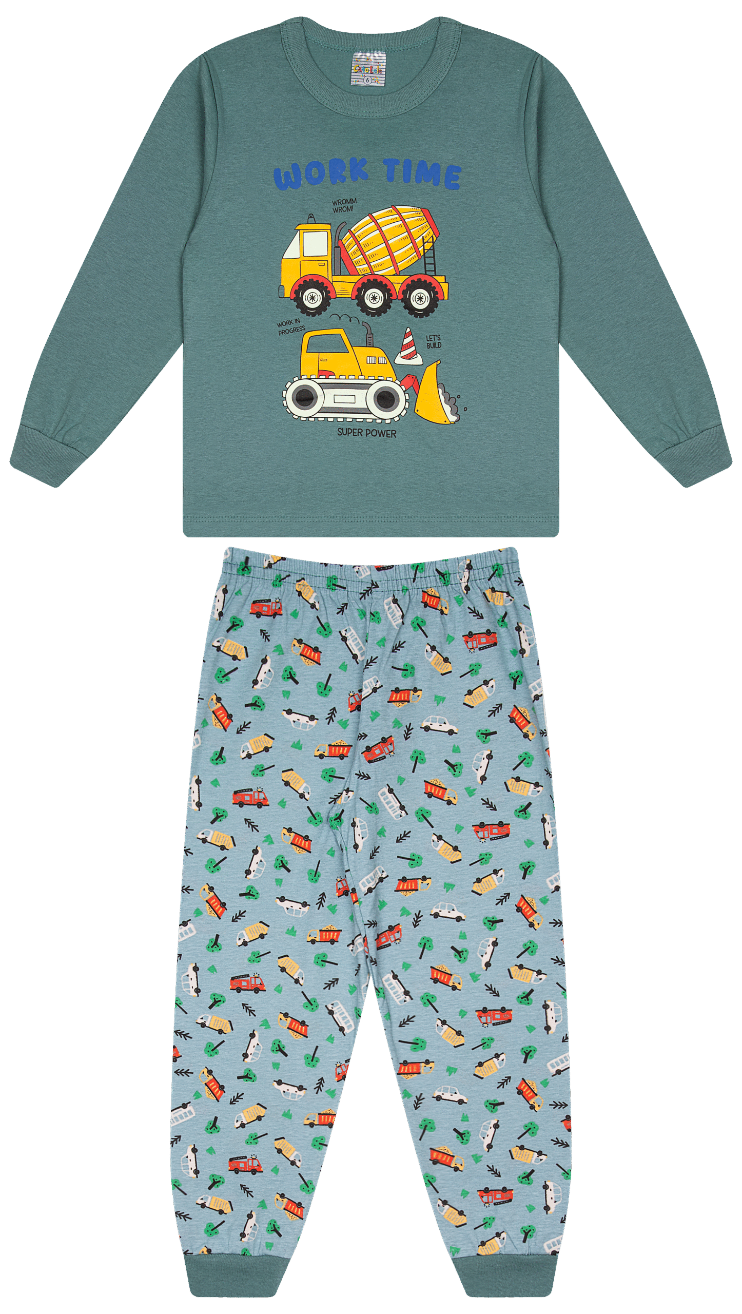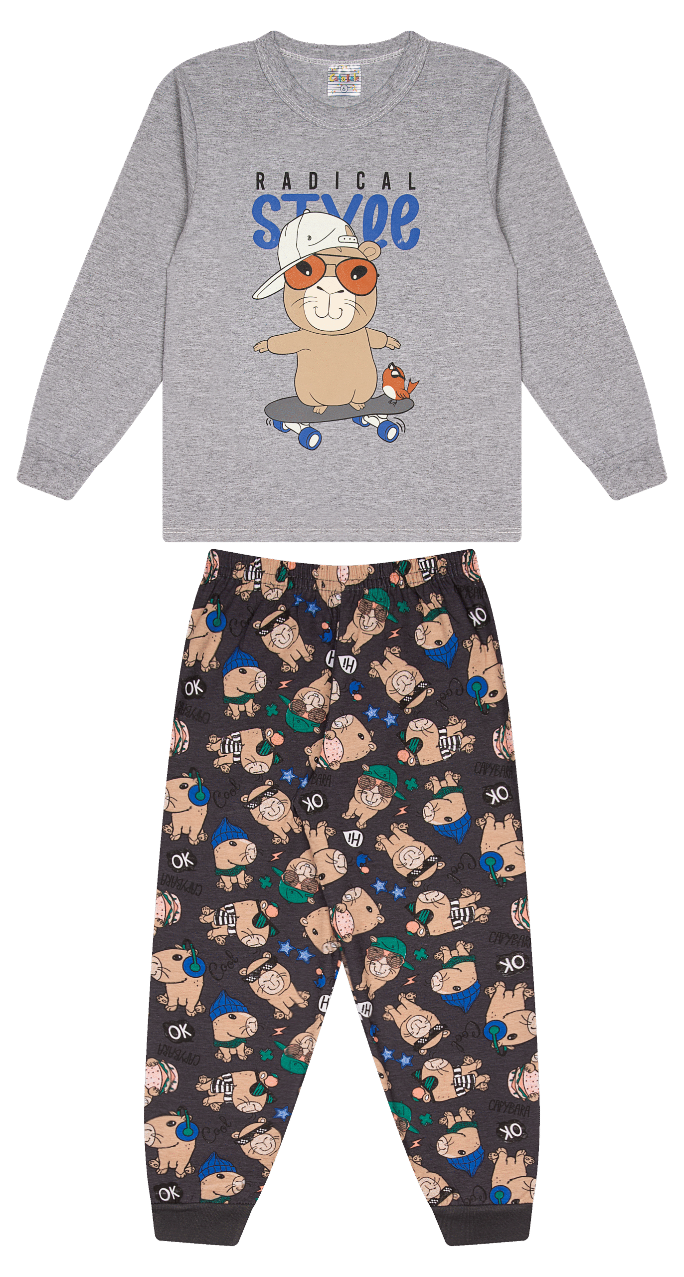 Pijama infantil em meia malha, desenvolvido para a coleção Outono/Inverno, ideal para revenda. Conjunto com blusa de estampa frontal e calça com estampa rotativa, oferecendo conforto, visual moderno e excelente custo-benefício para o varejo infantil.